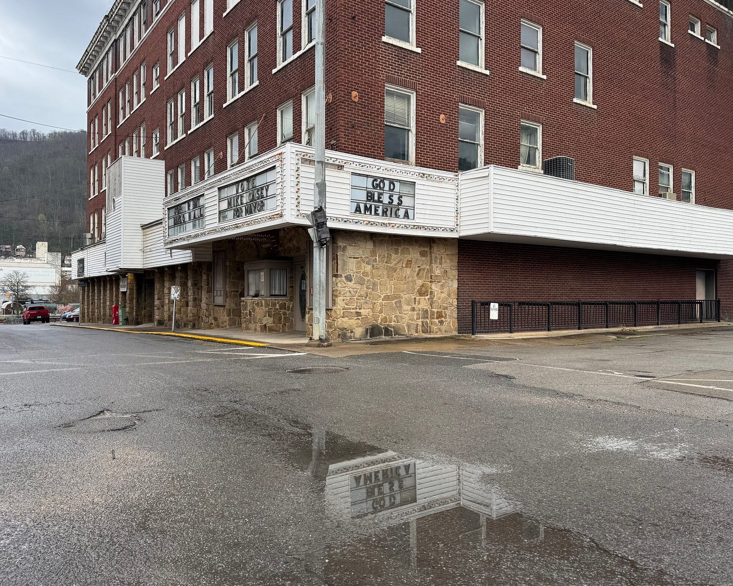 Usually, once a week I stop in downtown Williamson on the corner of Third Avenue and Logan Street and make a picture of the marquee on the old Cinderella Theatre (I wrote about it here last year). As I was walking back to my car (it feels weird to write car instead of truck, but read on), I caught the marquee’s reflection in a puddle which I liked as a one-off picture.
