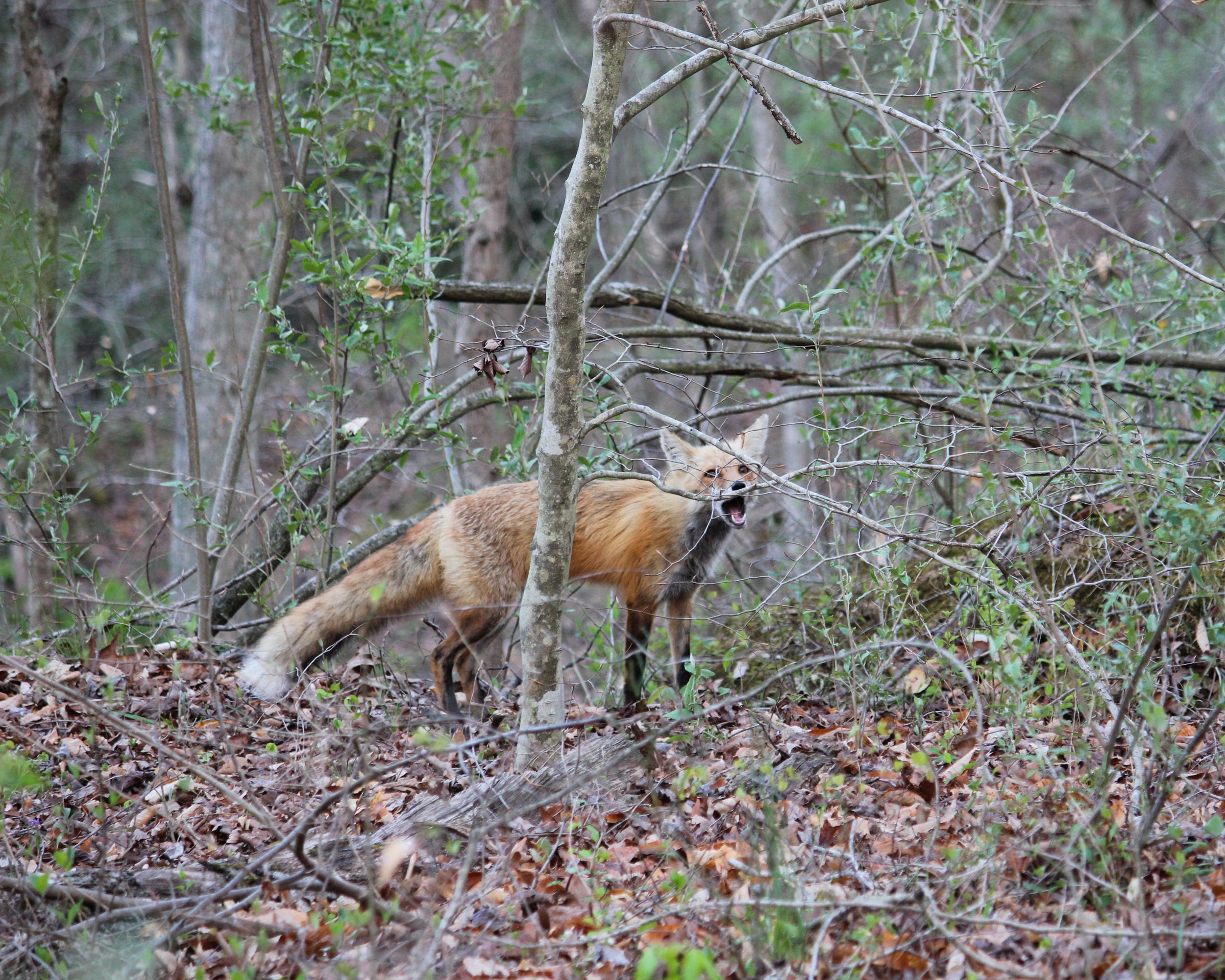 While walking the dogs this morning, we picked up some company along the way. One of the ridge foxes followed us for most of our half-mile loop maintaining her distance, but letting us know she was there through a series of barks and calls.