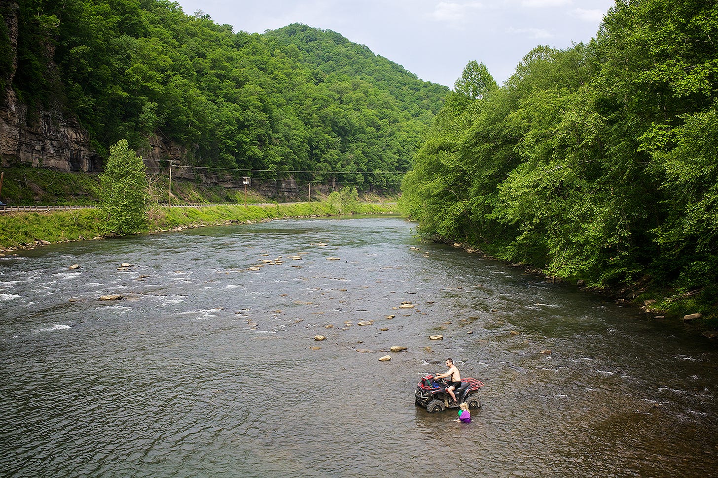 I was driving south in Gilbert, West Virginia along Highway 52, when out of the corner of my eye, I saw a four-wheeler in the Guyandotte River. I glanced over and saw a young man fishing from his four-wheeler and knew I had to turn around.